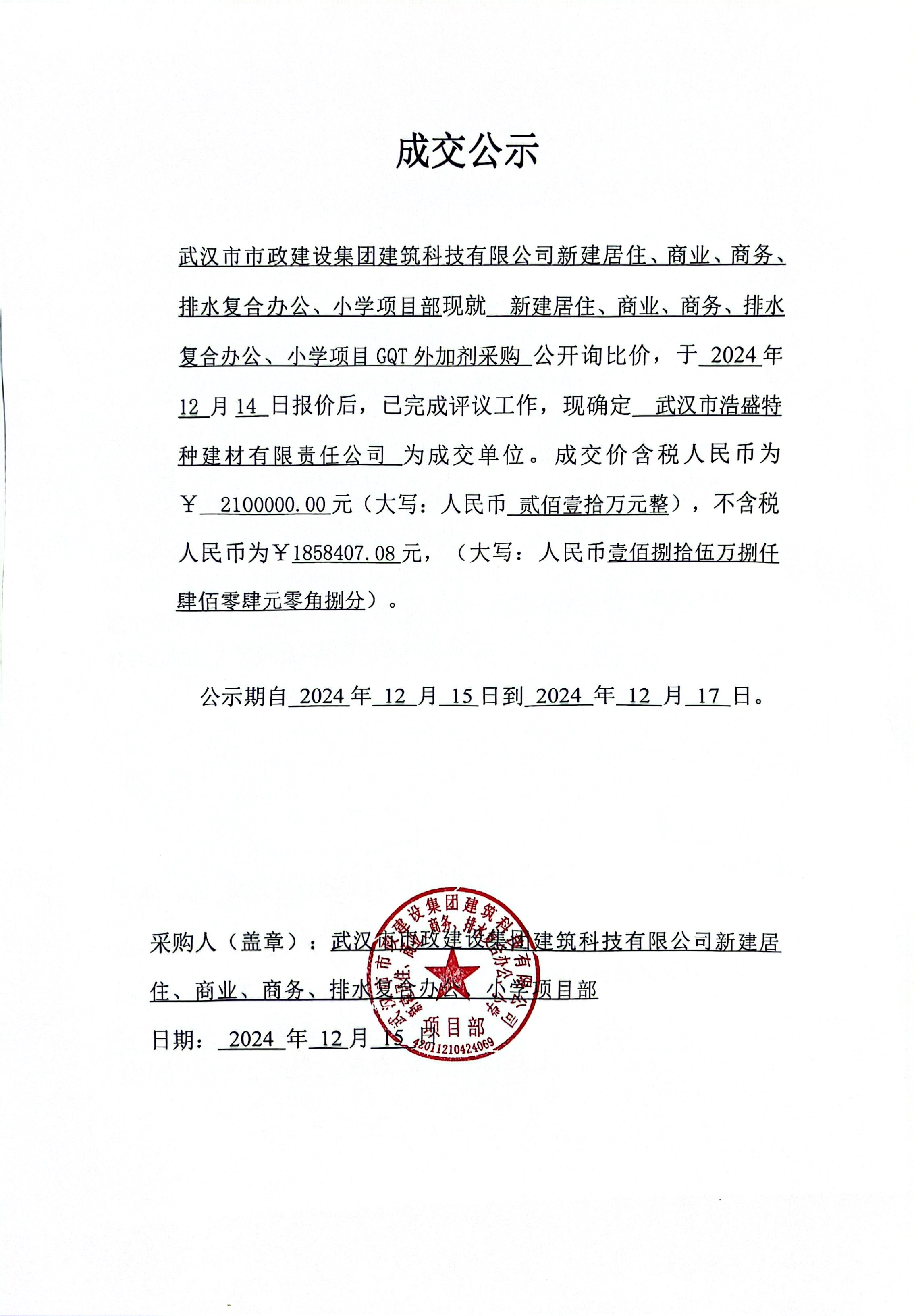 武漢市市政建設集團建筑科技有限公司新建居住、商業(yè)、商務、排水復合辦公、小學項目GQT外加劑采購成交公示